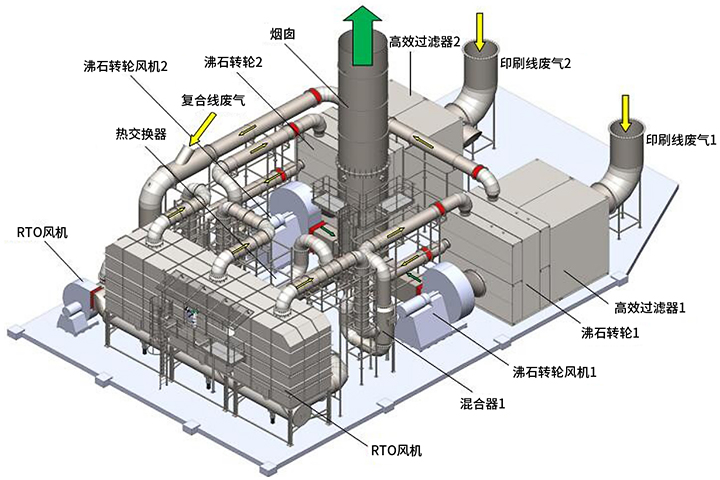 從2010年開始,與國內外(wài)專業的VOCs治理公司深入研究,分別設計不同的治理方案對印(yìn)刷、複合等工藝產生的VOCs進(jìn)行治理,VOCs廢氣穩定達標排放。其(qí)中針對印(yìn)刷工序的VOCs治理,公司投(tóu)資約4000萬人民幣,與國外專(zhuān)業的VOCs治理公司(sī)合作(zuò),引進具備世界先進水平的軟包裝VOCs治(zhì)理係統,采用“沸石轉輪濃縮+RTO燃燒+餘熱利用”的處理工藝,VOCs處理效率達95%以上,設計目(mù)標總VOCs排放濃度為50mg/m³,遠低於現(xiàn)行廣東省地方標準《印刷行(háng)業(yè)揮發性有機(jī)化合物排(pái)放(fàng)標準》(DB44/815-2010)總VOCs最高允許排放濃度為120mg/m³的(de)要求。